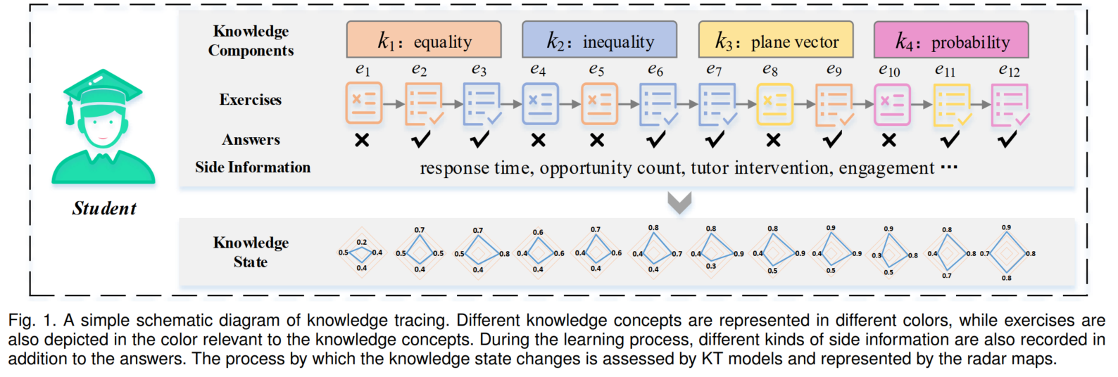 Given the sequence of students’ learning interactions in online learning systems, knowledge tracing aims to monitor students’ changing knowledge states during the learning process and accurately predict their performance on future exercises; this information can be further applied to individualize students’ learning schemes in order to maximize their learning efficiency.