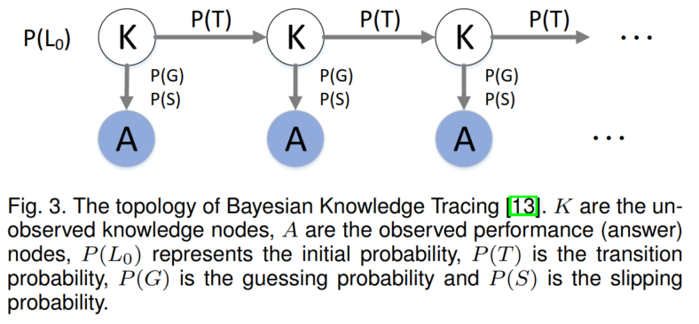 Bayesian Knowledge Tracing ,是特殊的HMM模型。因此,包含transition probabilities和emission probabilities。